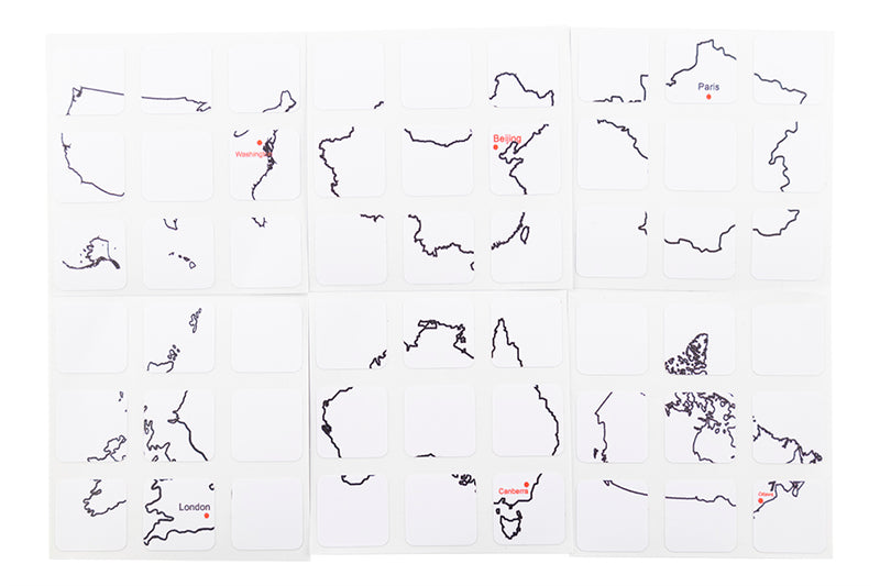 Turn your 3x3 into a world map with this novel sticker set. It has outlines of continents with major cities included.
