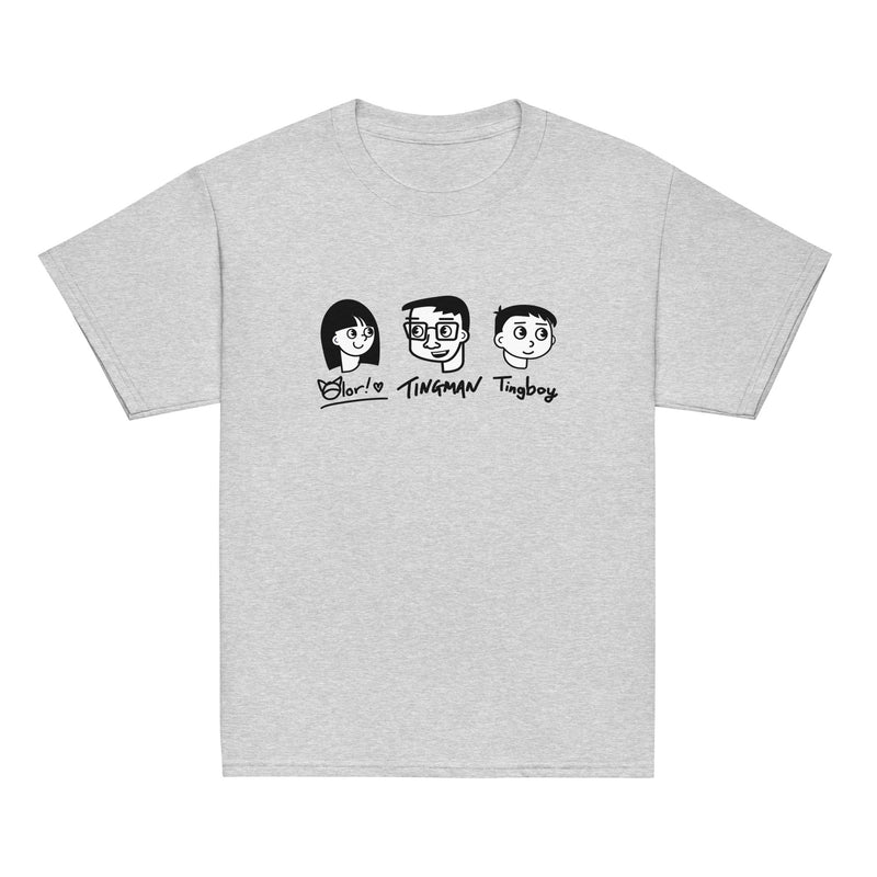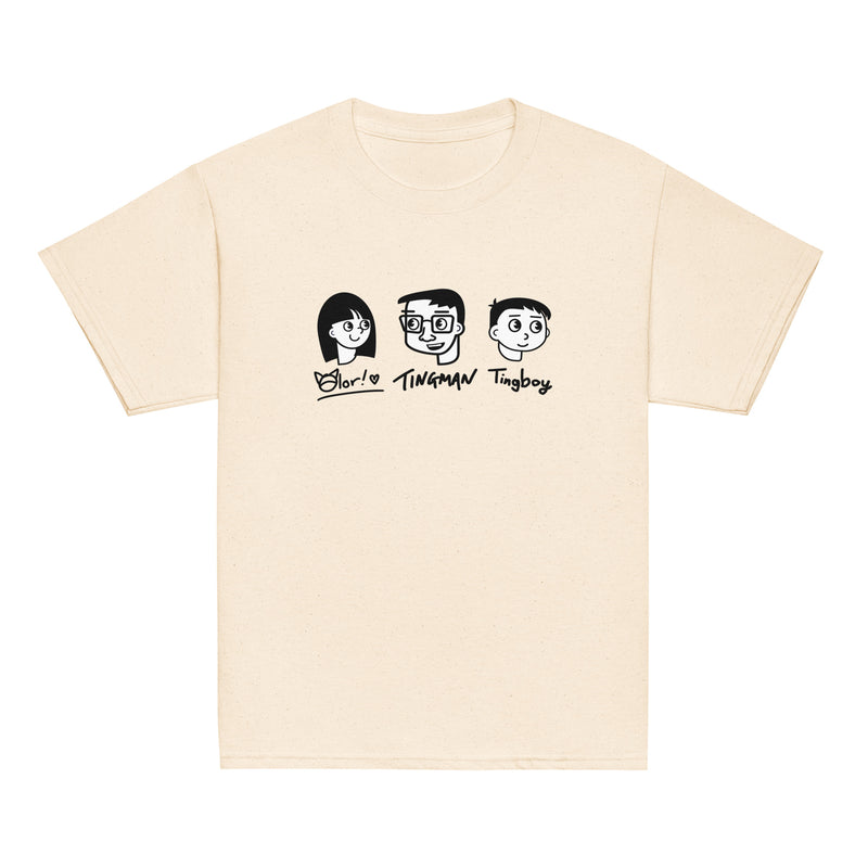 This is the youth version of the Tingman Signature T-Shirt. It features endearing cartoon versions of the Tingman family alongside each person's autograph. Get yours today!