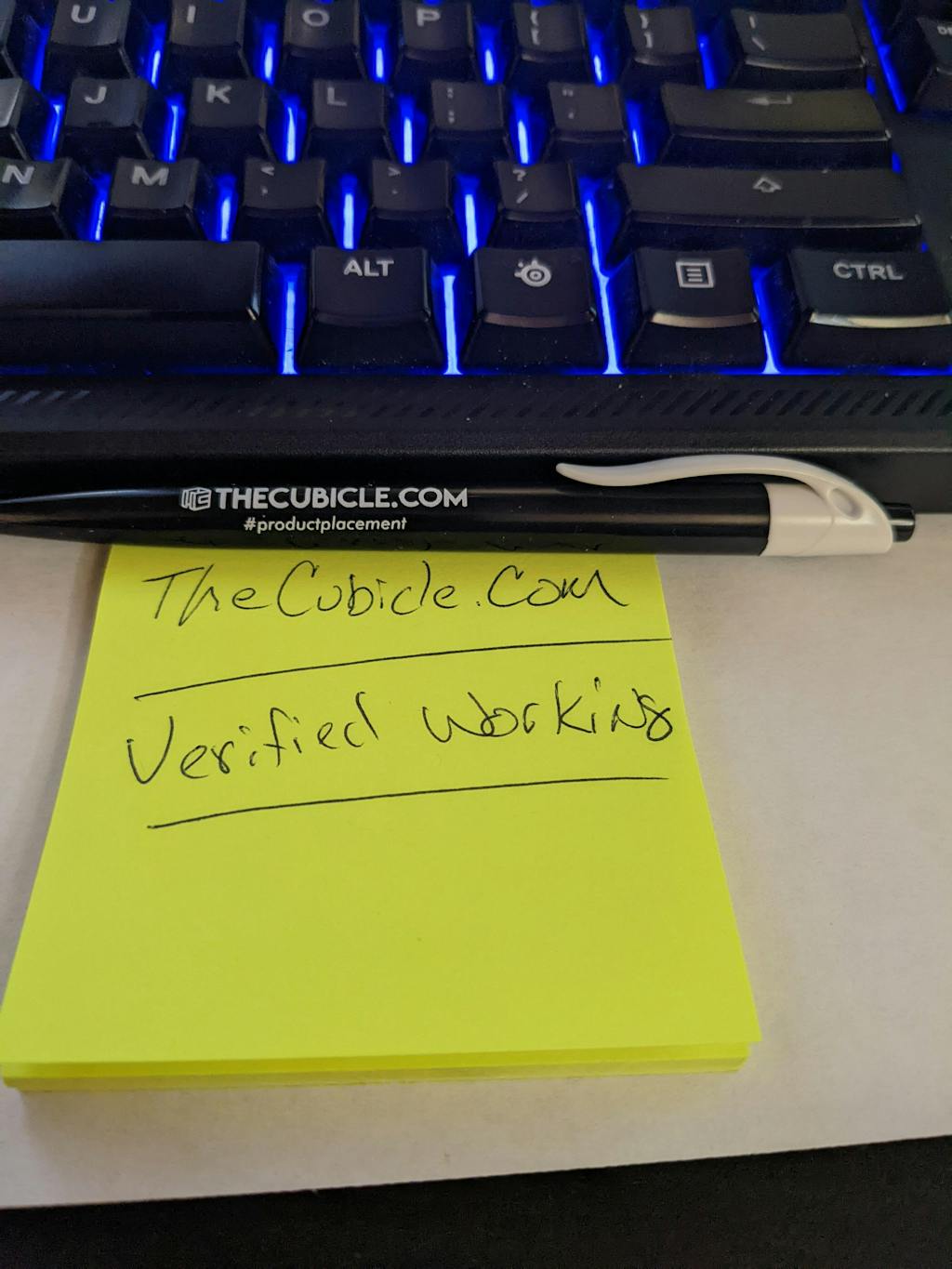 The Cubicle Pen is a self-aware pen with the text "TheCubicle.com #productplacement" on the barrel next to the Cubicle wireframe logo. This is a retractable pen with blue ink.