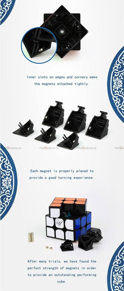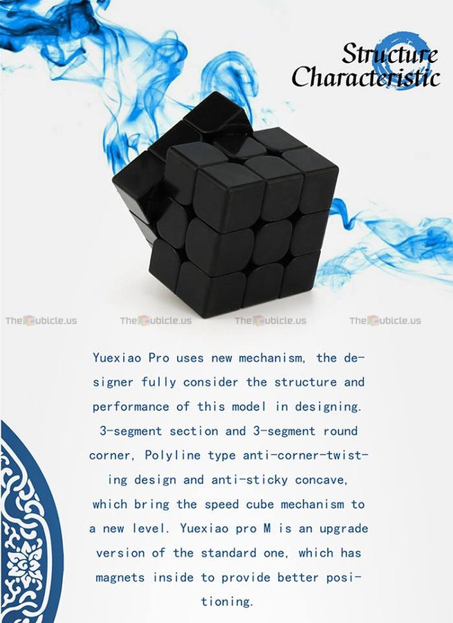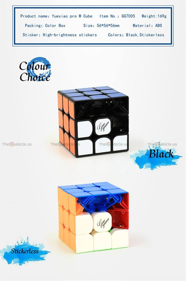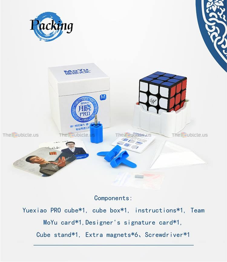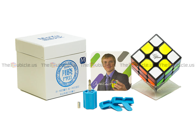 The GuoGuan YueXiao Pro M is the factory-magnetized version of the YueXiao Pro. It features magnets placed in special slots in the corners and edges to provide a more tactile and comfortable cubing experience. The YueXiao Pro M is packaged inside a specially-marked display box, and it includes extra magnets, a mini screwdriver, tensioning tools, a cube stand, and a collectible MoYu card.